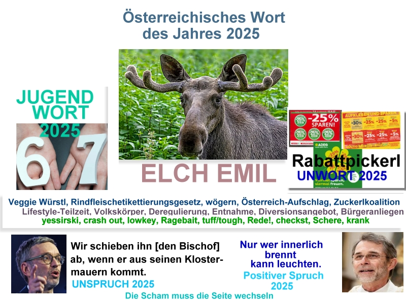 Wie jedes Jahr hat auch heuer die »Gesellschaft für Österreichisches Deutsch« in Graz das Wort, das Unwort, das Jugendwort, sowie den positiven und negativen Spruch des Jahres gewählt. Ich versuche auch heuer wieder anlässlich des Jahreswechsels aus den Erstplatzierten jeder Kategorie einen Kurztext zu verfassen und – wie es sich für FederLesen gehört – wird’s einen Nonsens-Zusammenfassung: